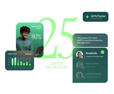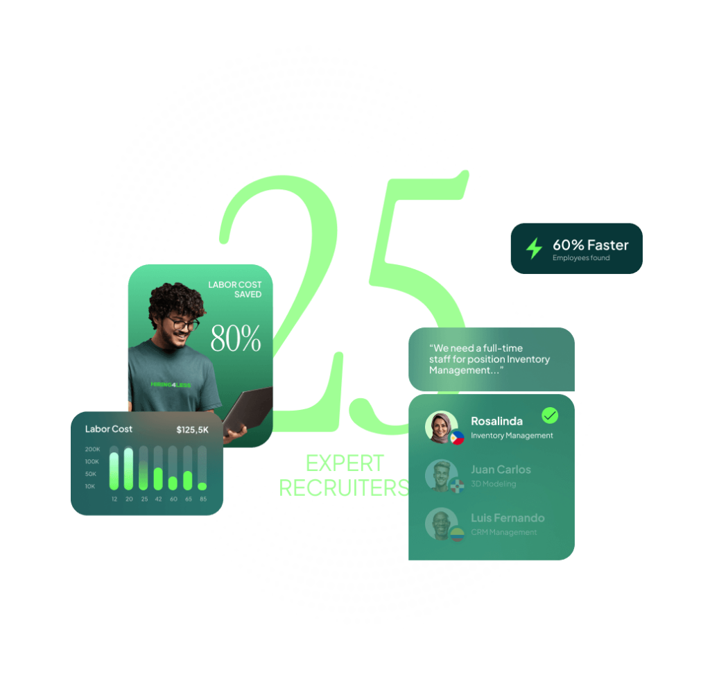 With 25 skilled recruiters, we quickly find and understand the expertise you need. By leveraging overseas talent, we reduce labor costs significantly, providing you with high-quality employees at a fraction of the usual expense.