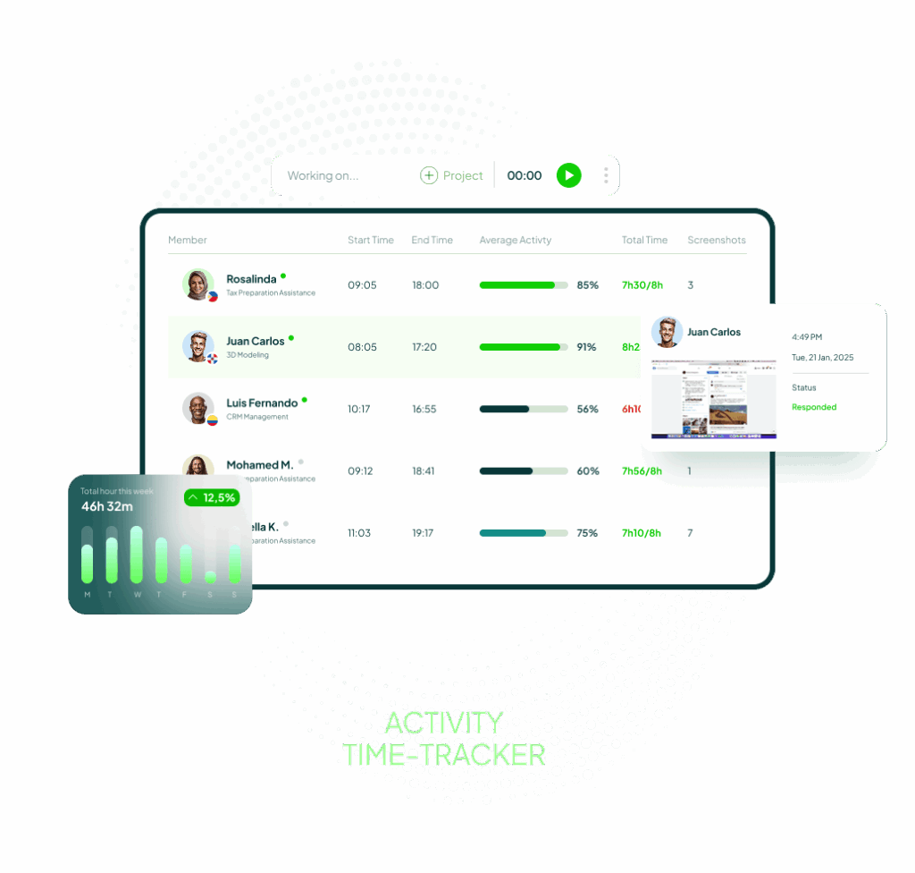 We utilize a program that performs three key functions: monitoring activity levels, capturing screenshots, and logging employee times. This ensures your employees are working efficiently and effectively, and allows you to review their daily activity at any time.